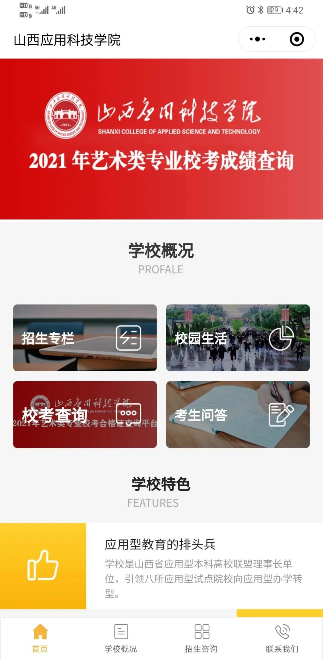 1.查询方法:搜索微信小程序:山西应用科技学院,点击飘窗“2021年艺术类专业校考成绩查询平台”进入查询页面,输入姓名、证件号查询。2.查询时间:2021年4月29日—2021年5月30日